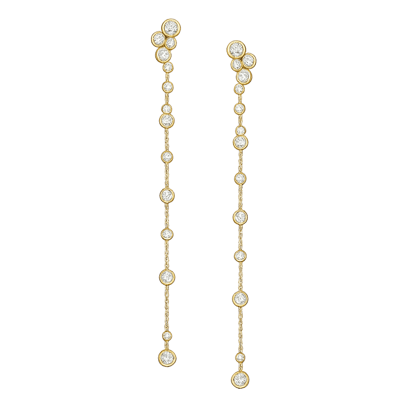 Designed to move with you, the Stellar Diamond Chain Earrings feature a refined cascade of bezel-set diamonds delicately linked by a fine gold chain. Each diamond is thoughtfully spaced to create a fluid, elongated silhouette that catches the light from every angle.