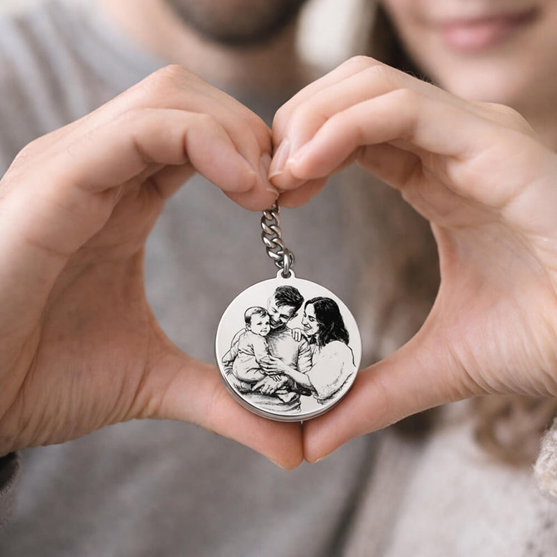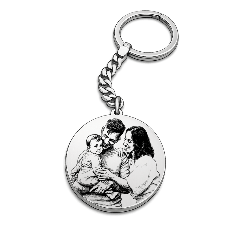 This custom keychain features a laser-engraved photo, carefully transformed into a refined sketch-style engraving for maximum clarity and durability. Each piece is engraved on a round, matte-finish silver surface, delivering a subtle, modern look that feels both personal and luxurious.