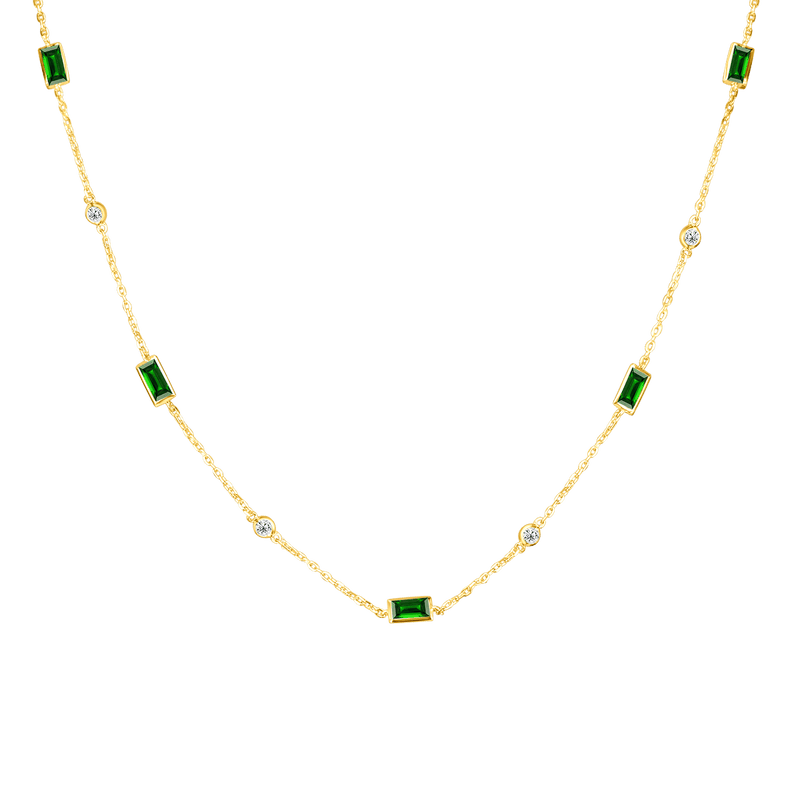 A touch of timeless grace — the Princess Emerald Necklace captivates with alternating baguette and princess-cut stones in vibrant green, symbolizing renewal and luxury.