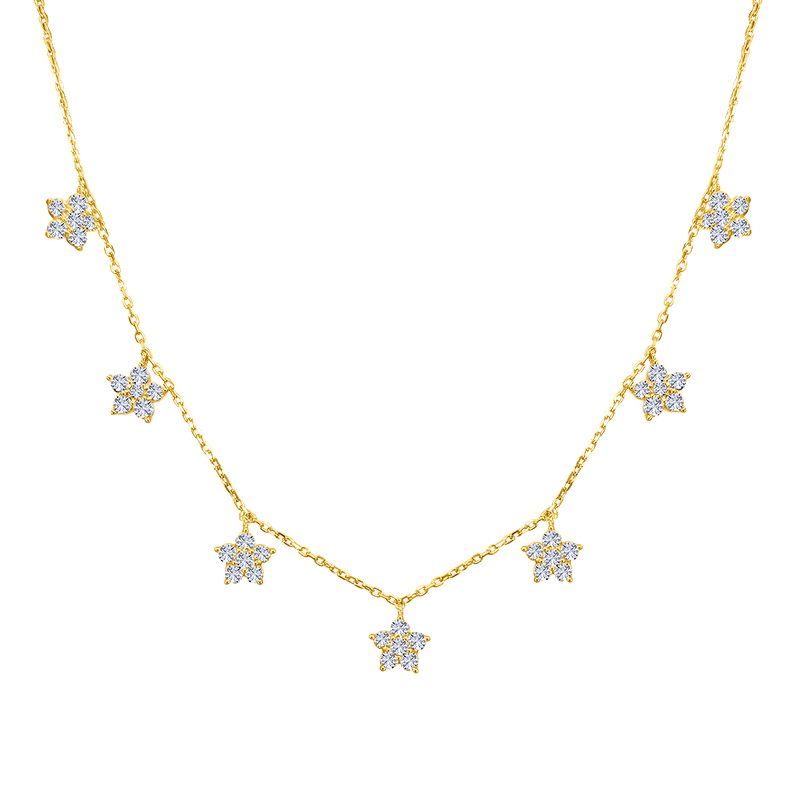 Each flower pendant is meticulously crafted with brilliant zirconium stones, forming a graceful sparkle that rests lightly along the neckline.