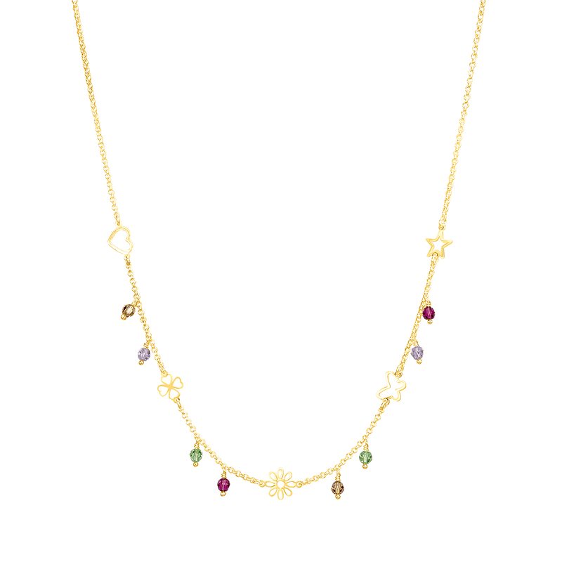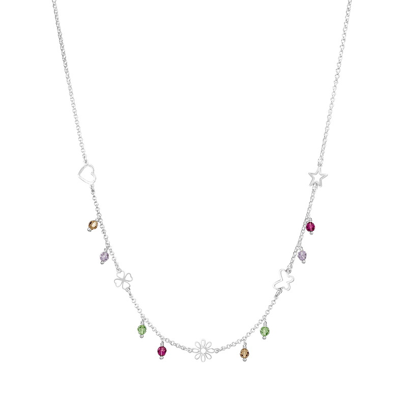Featuring a delightful mix of butterfly, heart, flower, and clover charms, each accented with colorful crystals, it adds a touch of whimsy and positivity to every look.