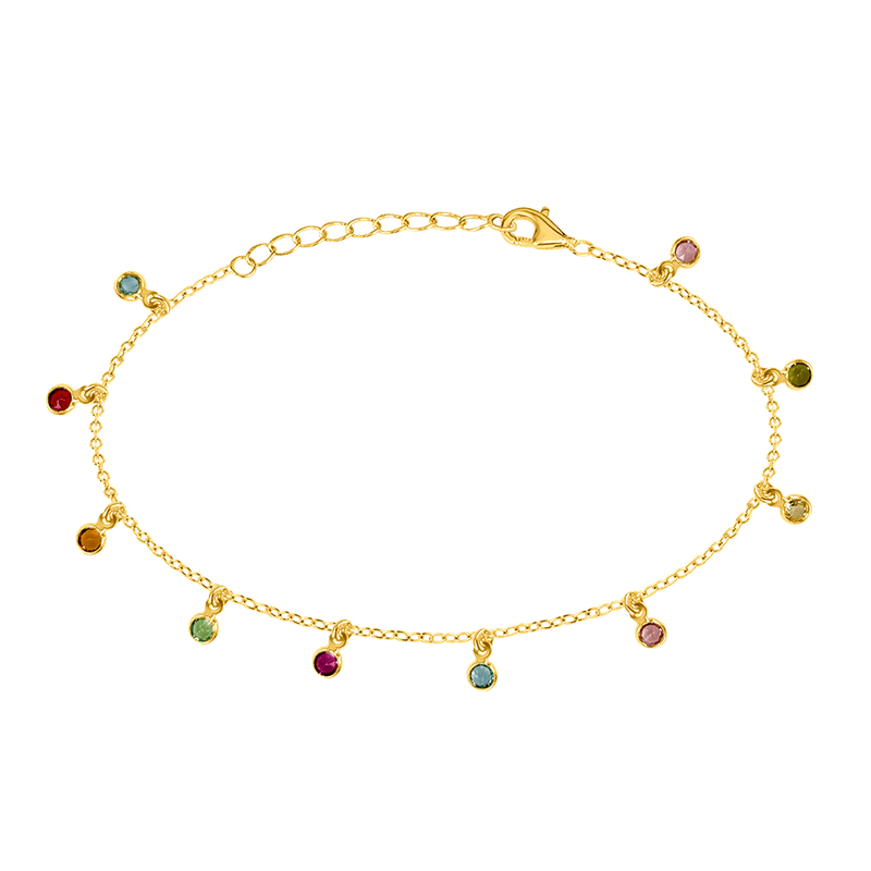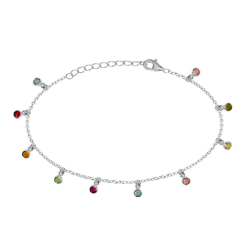 This playful design features a delicate chain adorned with vibrant round-cut gemstones in a rainbow of shades — capturing the warmth and spirit of tropical beauty.