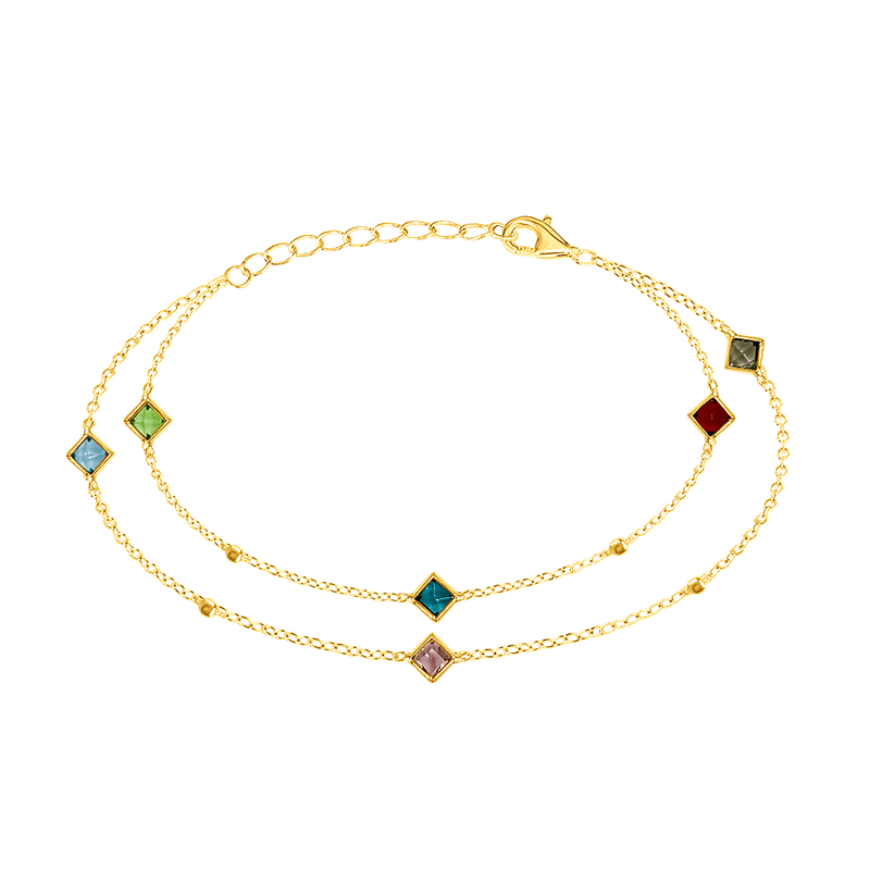 Featuring two delicate chains adorned with square-cut colorful gemstones, it creates a layered look full of movement and charm.