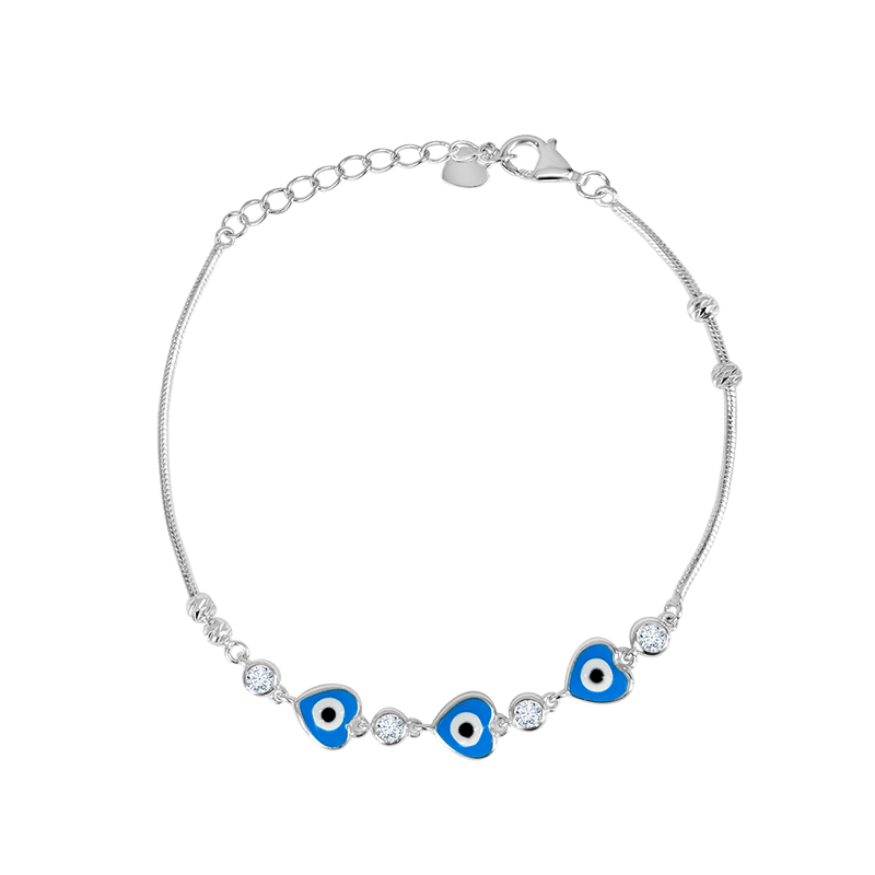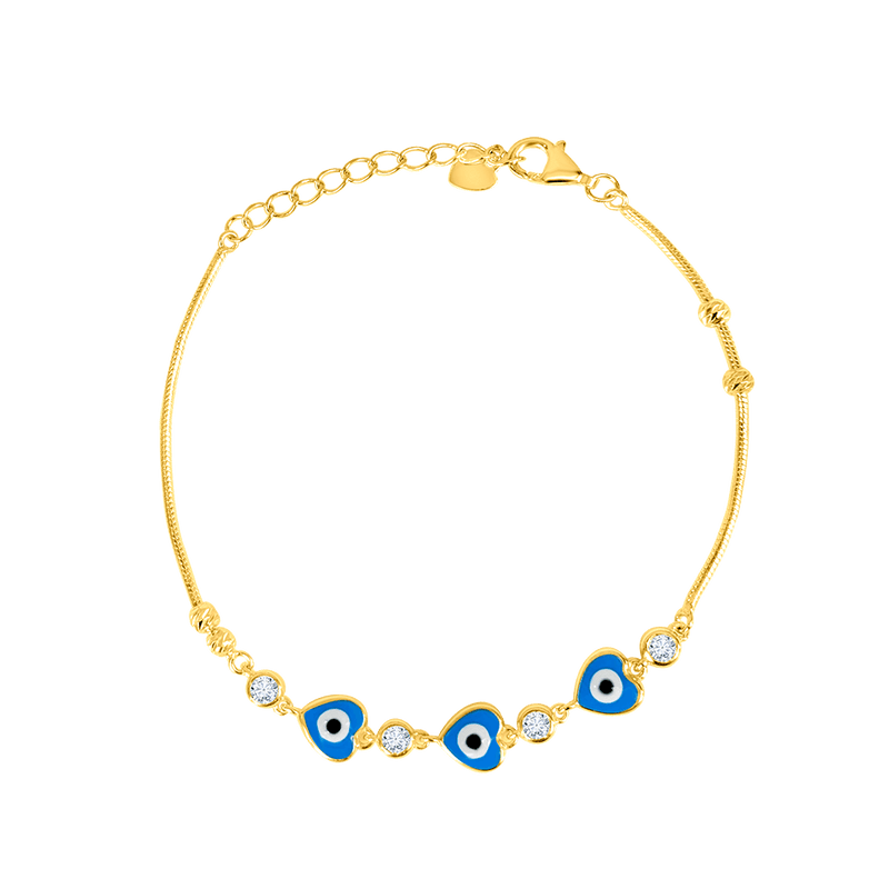 The Heart Evil Eye Enamel Bracelet features three heart-shaped enamel charms in a vibrant blue tone, each delicately paired with sparkling zircon stones for a radiant, balanced look.