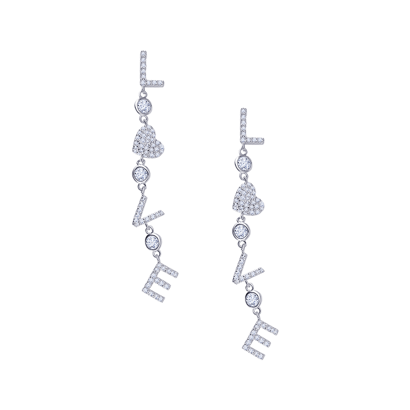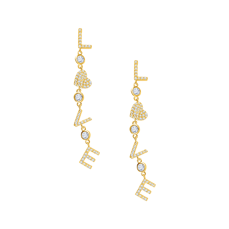 Featuring a cascading arrangement of pavé-set “LOVE” letters, shimmering hearts, and bezel-set stones, these earrings catch the light beautifully with every movement — making them a standout piece for any occasion.