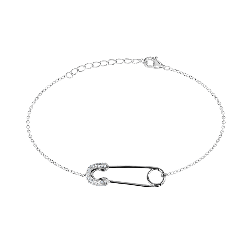 Featuring a sleek safety pin design embellished with shimmering zircon pavé, it captures the perfect balance between rebellion and refinement.