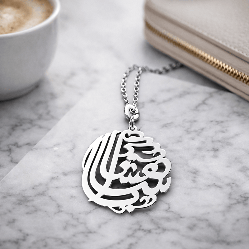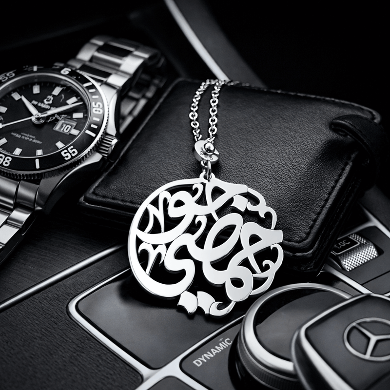 At the center, up to three names are meticulously handcrafted in elegant Arabic calligraphy, creating a striking see-through design that celebrates identity, family, and connection. Each piece is carefully finished to achieve a refined, long-lasting shine suitable for daily use.