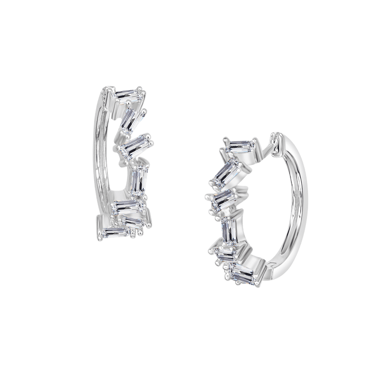 Featuring a row of precisely cut baguette Zirconium Diamonds set along a sleek hoop silhouette, these earrings catch the light from every angle — delivering a sophisticated sparkle that elevates any look.