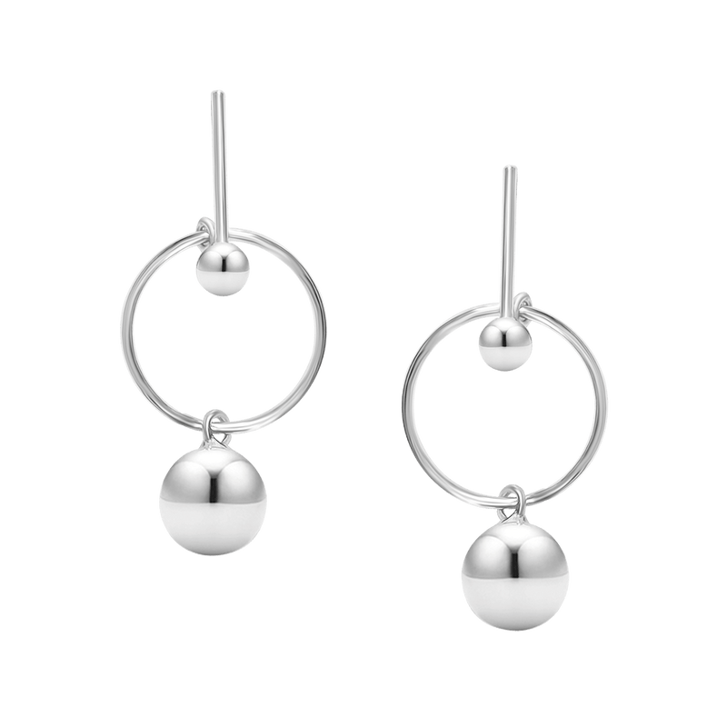 Featuring sleek circular hoops accented by polished spheres, these earrings offer a bold yet minimalist look that moves gracefully with every step. Their sculptural silhouette makes them a statement piece for both casual and evening wear.