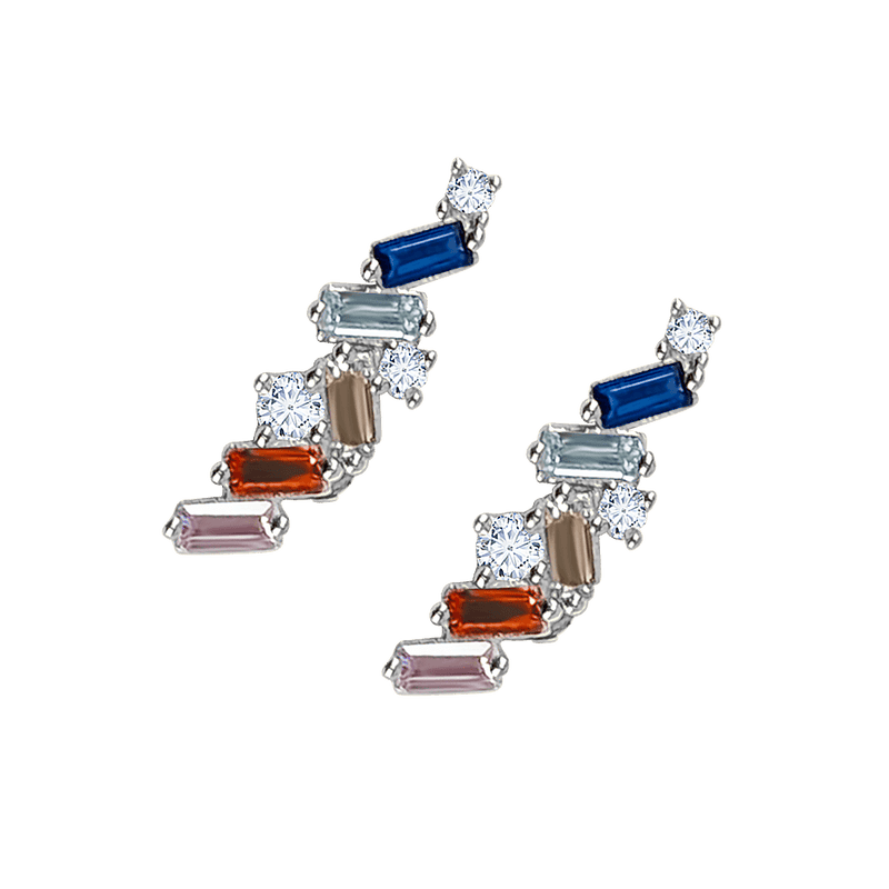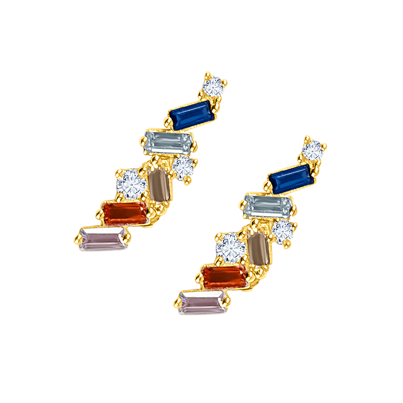 Set with an array of multicolor baguette Zirconium stones complemented by brilliant round accents, these studs bring a joyful elegance that’s perfect for both everyday wear and special occasions.